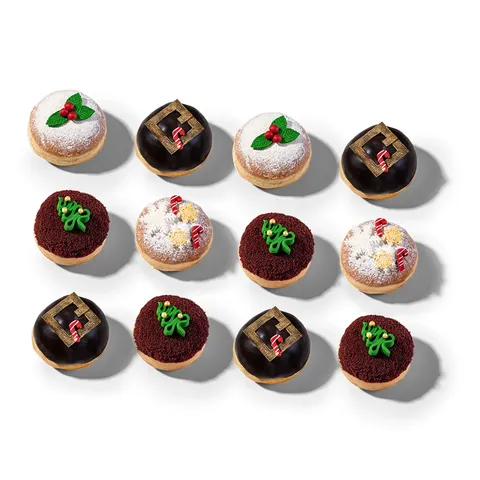 A dozen soft, fluffy donuts with creamy fillings and festive touches, perfect for sharing the sweetness