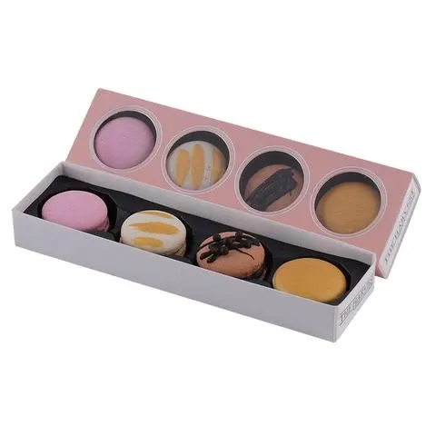 A delicate assortment of four flavorful macarons, crafted to perfection with a crisp shell and soft, chewy center.