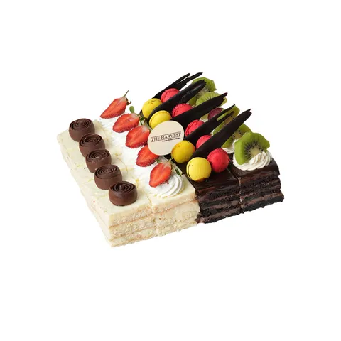 Mix Vanilla Chocolate 20x20cm pre-cut cake! Each slice, measuring 4x4cm, is a tantalizing blend of Mix Vanilla Fruit and smooth Milk Chocolate. Get ready to indulge in the perfect fusion of sweet Vanilla Fruit and creamy Milk Chocolate with every heavenly bite.